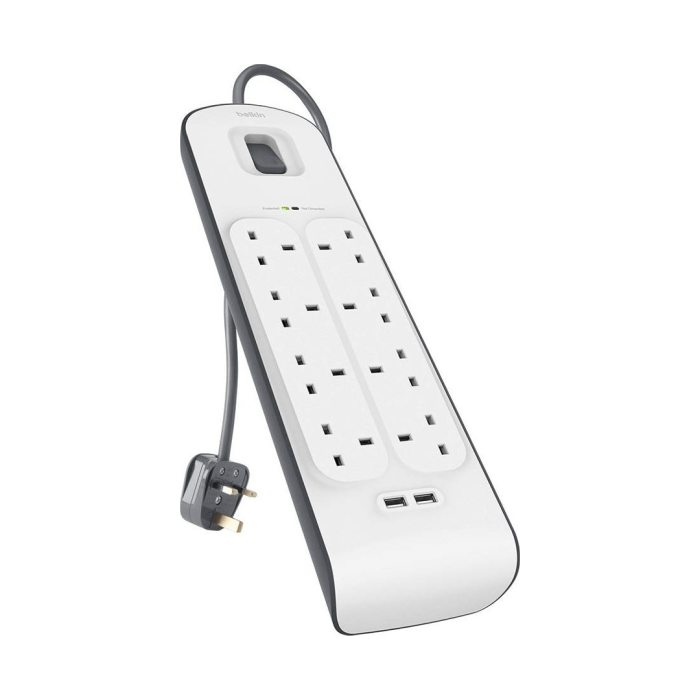 The Belkin Surge Protection Strip features high-quality construction and a durable design with damage-resistant housing that protects circuits from fire, impact, and rust. Eight protected AC outlets make this strip an ideal solution for home offices, entertainment centers, and other areas where multiple devices need to be connected. A large recessed power switch helps ensure you never accidentally power off your connected devices and makes reboots easy, while sliding safety covers help protect children from harm. The Belkin Surge Protection Strip also includes a Not-Grounded Indicator that warns you when your outlet is not properly grounded.HEAVY-DUTY 2-METER POWER CORD